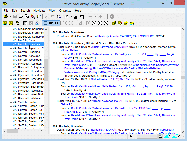 The nice thing about most Genealogy programs is that they are relatively easy to use. That's because they have a simple form-based interface for you to enter your data. But that does slow your data entry down and only helps get your data in, not out. Behold will give you the edge you need, letting you get your data in quickly like a word processor, while simultaneously providing you total access to all your data however you may want to view or filter it.