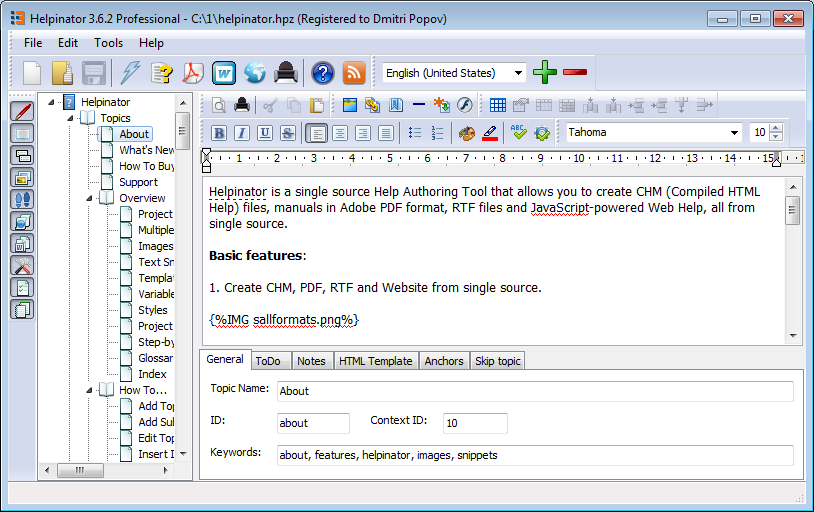 Helpinator is a single-source help authoring tool. It allows you to create help and manuals in different formats from single source. You write text in WYSISYG editor with styles and spellchecker, then click one button and documentation in a desired format is ready to go!