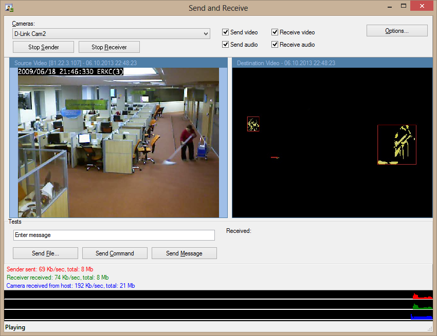 In addition to video, this demo sends to itself audio data read from a microphone. Also it can send a file, a message and a test command.