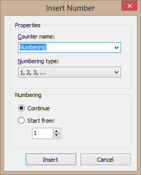 - “page number” and “page count” fields; they can be inserted in the main document, headers and footers, notes and text boxes